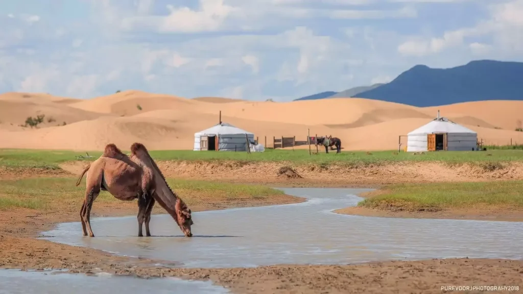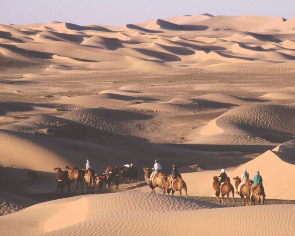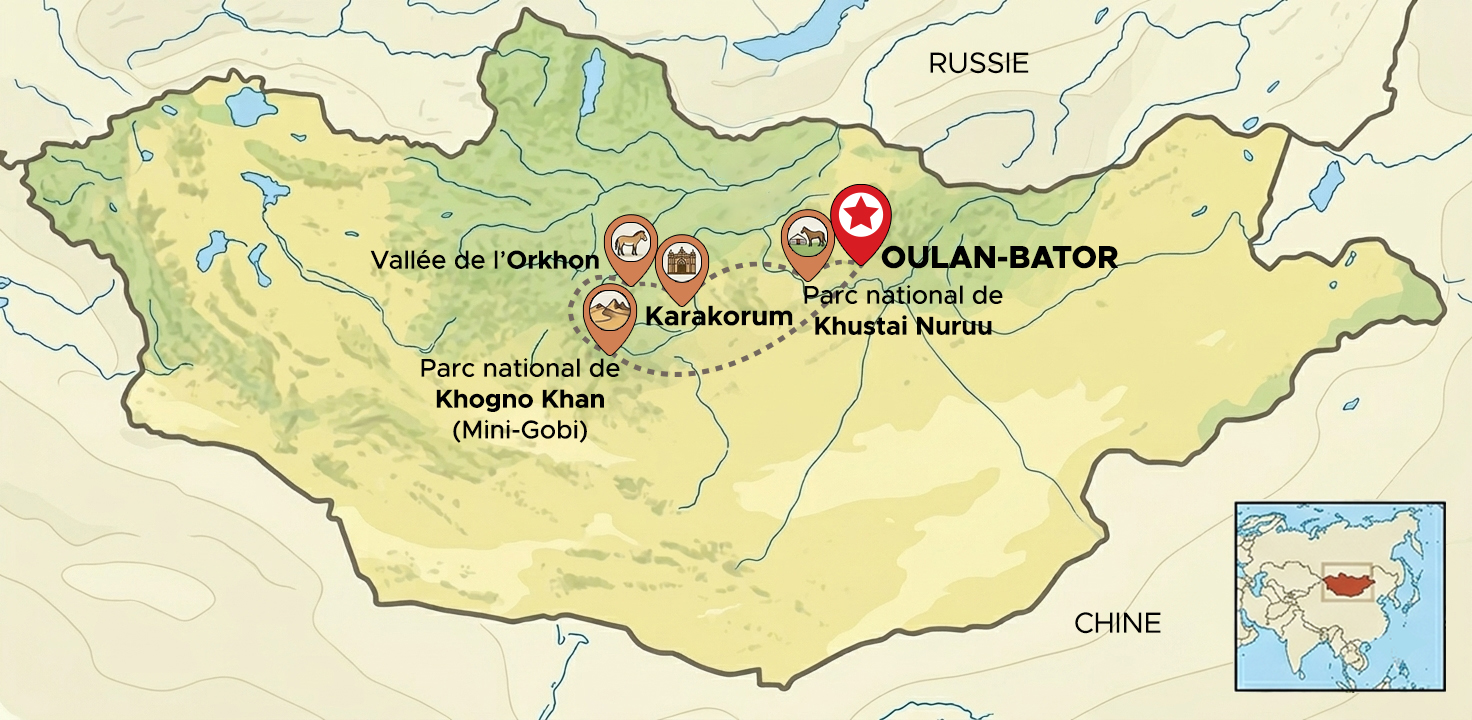 L’itinéraire relie plusieurs mondes : la capitale, un grand monastère au calme d’une vallée, la dépression de Darkhad et ses paysages humides, la taïga des éleveurs de rennes Tsaatan (Dukha), les rives du lac Khövsgöl, puis une longue traversée de paysages volcaniques (Uushigiin Uvur, lac Zuun, Terkhiin Tsagaan Nuur, Khorgo) jusqu’aux dunes du Mini-Gobi.